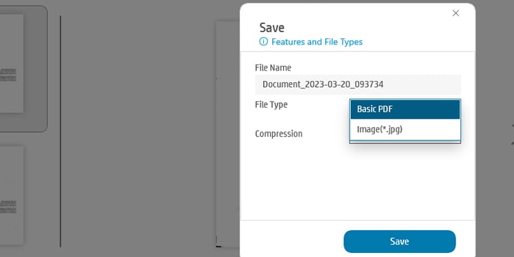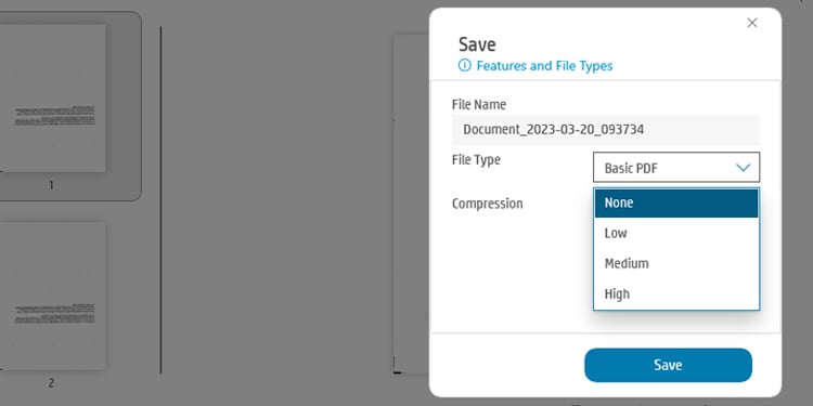 Wprowadź potrzebne zmiany i kliknij Gotowe. Teraz kliknij przycisk Zapisz, aby zapisać zeskanowany dokument lokalnie na swoim urządzeniu. Otworzy się małe wyskakujące okienko. Możesz zapisać go jako plik PDF lub obraz (.jpg). Możesz także wybrać poziomy kompresji.