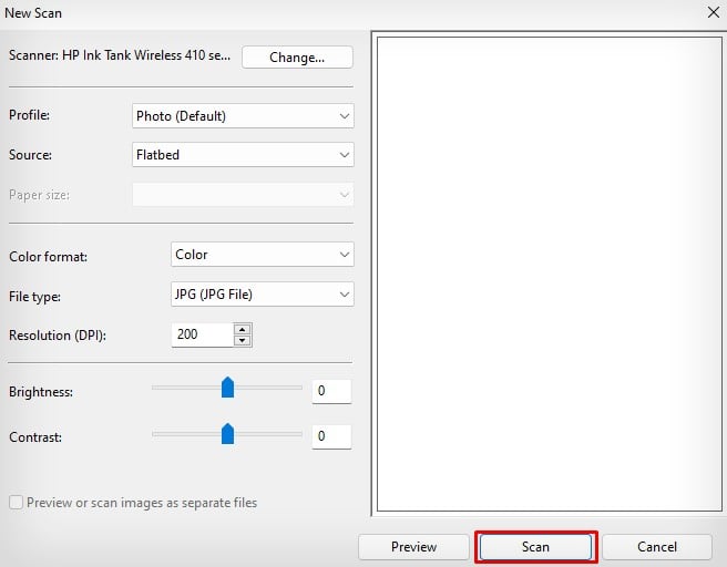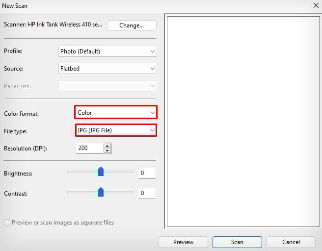 Otworzy się okno Nowe skanowanie. W tym oknie możesz zmienić format koloru, typ pliku, jasność i kontrast .