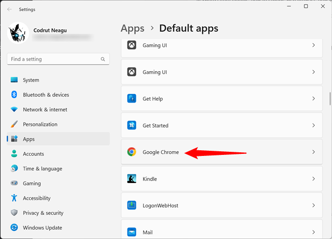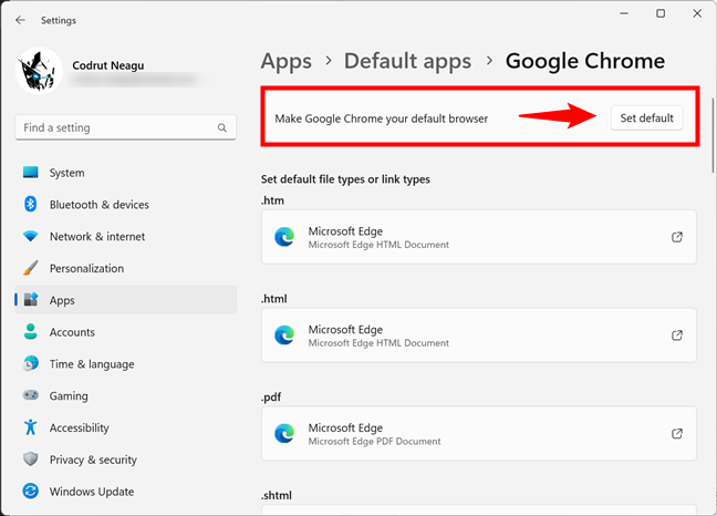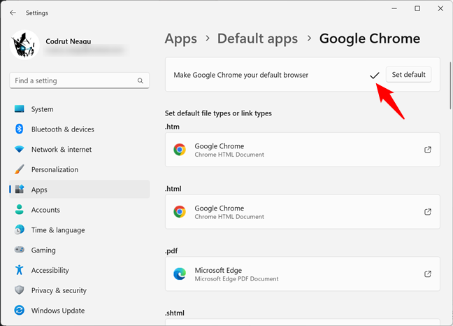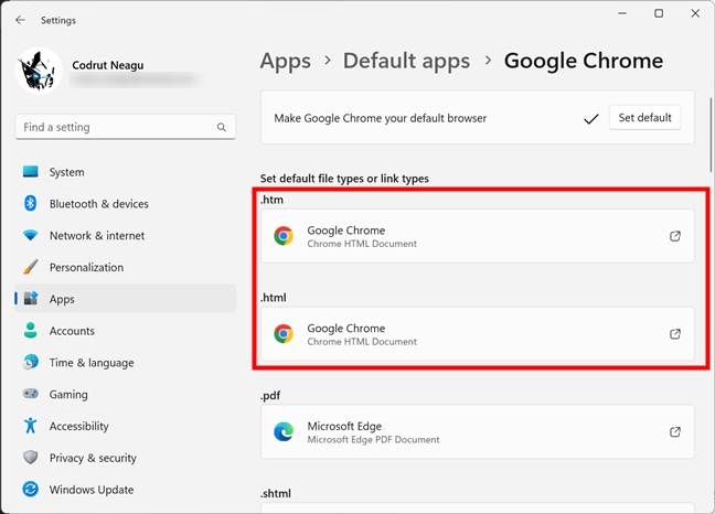 WSKAZÓWKA: Jeśli jedno z pytań brzmi: „Jaka jest moja domyślna przeglądarka w systemie Windows 11?” wiedz, że możesz to stwierdzić tylko patrząc na przeglądarkę ustawioną jako domyślną dla wspomnianych wcześniej typów plików i typów linków:.htm,.html, HTTP i HTTPS. Na przykład, jeśli sprawdzisz Google Chrome w Ustawieniach> Aplikacje systemu Windows 11 i zobaczysz, że to ten, który otwiera te typy plików/linków, oznacza to, że Chrome jest Twoją domyślną przeglądarką. Niestety, jeśli na komputerze masz zainstalowanych wiele przeglądarek, będziesz musiał przeglądać każdą z nich, aż znajdziesz tę ustawioną jako domyślną.