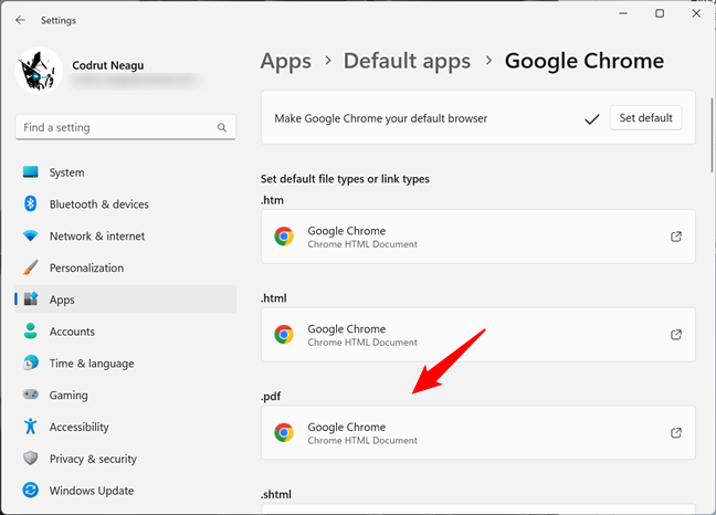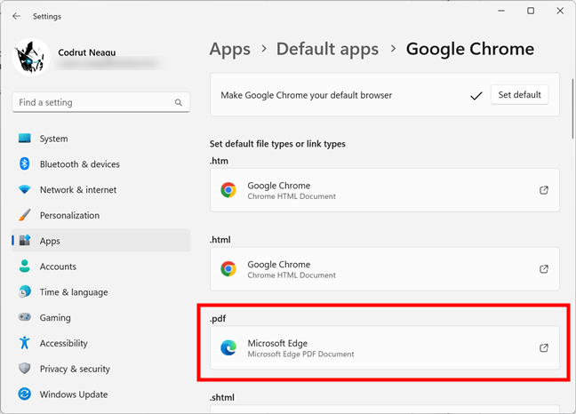 Ustawienia, które pokazałem w pierwszym rozdziale tego przewodnika, sprawiają, że Chrome jest domyślną przeglądarką w systemie Windows 11, co oznacza, że każda witryna otworzy się za pomocą Google Chrome. Jednak nadal istnieją inne typy plików, które może obsłużyć, ale domyślnie nie są ustawione do otwierania w Chrome. Na przykład pliki PDF mogą nadal ładować się w przeglądarce Microsoft Edge lub Adobe Reader, w zależności od zainstalowanych aplikacji i sposobu ich konfiguracji.