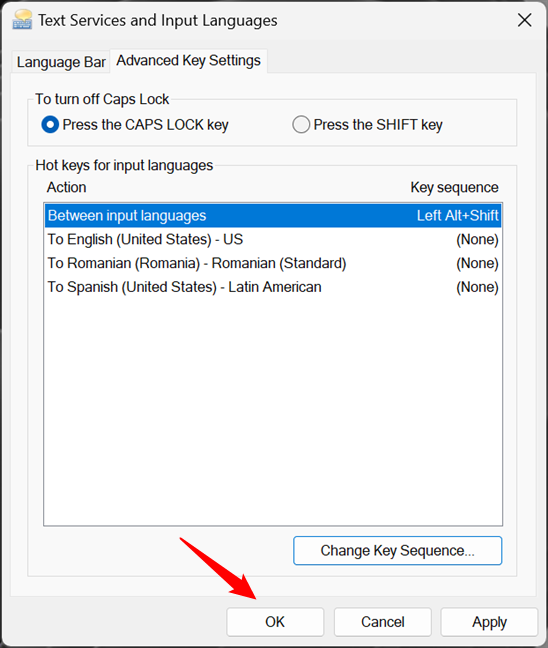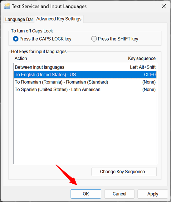 Naciśnięcie OK powoduje powrót do zakładki „Zaawansowane ustawienia klawiszy” w oknie „Usługi tekstowe i języki wprowadzania”. Kliknij lub dotknij OK lub Zastosuj, aby zapisać nowe ustawienia.