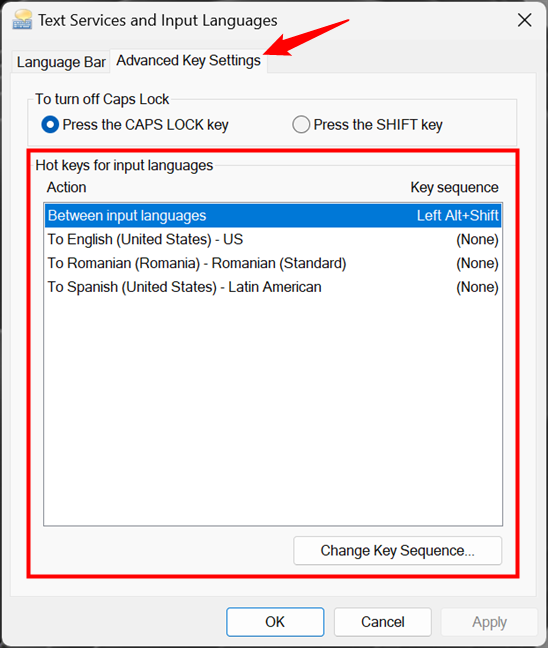 Otworzy się stare okno o nazwie „Usługi tekstowe i języki wprowadzania” , a jej karta Zaawansowane ustawienia klawiszy jest automatycznie aktywowana. W tym miejscu możesz zmienić skróty klawiaturowe używane przez system Windows 11 z sekcji „Klawisze skrótów dla języków wprowadzania”, która zajmuje większą część okna.