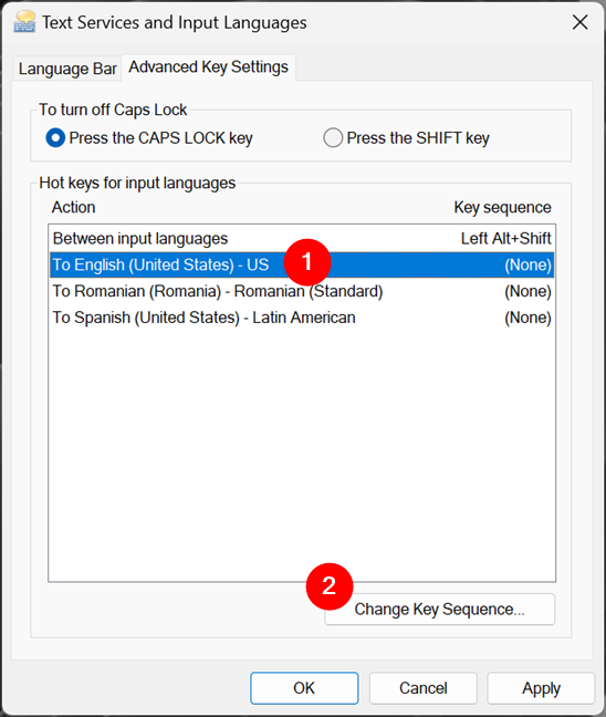 W oknie „Usługi tekstowe i języki wprowadzania” wybierz dowolny układ z „Klawisze skrótów dla języków wprowadzania” listę i kliknij lub naciśnij „Zmień sekwencję klawiszy”.