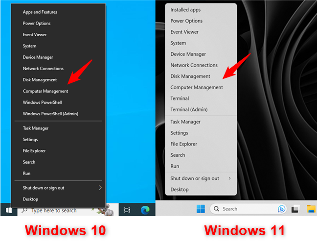 Otwórz Zarządzanie komputerem — szybkim sposobem na zrobienie tego w obu systemach operacyjnych jest jednoczesne naciśnięcie klawiszy Win + X na klawiaturze i wybranie z menu opcji Zarządzanie komputerem.