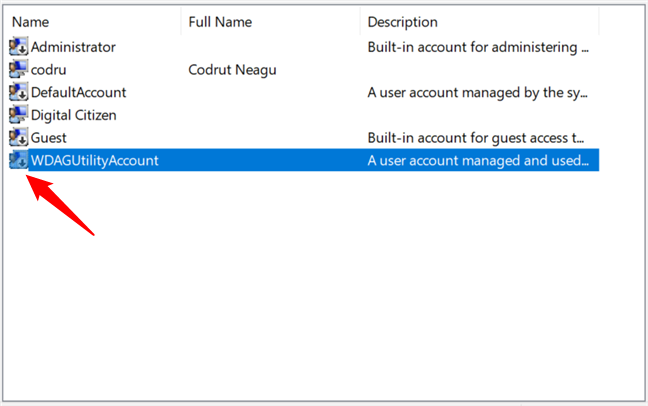 wszystkie konta użytkowników utworzone na komputerze z systemem Windows; Administrator – wbudowane konto tworzone przez system Windows niezależnie od tego, czy z niego korzystasz, czy nie, tworzone przez system operacyjny w celach administracyjnych; DefaultAccount — konto użytkownika zarządzane przez system Windows; Gość-kolejne wbudowane konto, które może służyć jako gość na komputerze lub domenie; WDAGUtilityAccount — zarządzane i używane przez program antywirusowy Microsoft Defender do uruchamiania określonych procesów (takich jak przeglądarka Microsoft Edge) w środowiskach piaskownicy/zwirtualizowanych.
