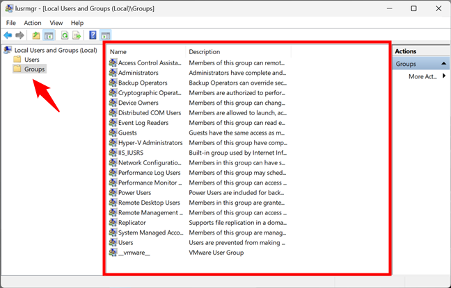 Wracając do konsoli Local Users and Groups (lusrmgr.msc), w folderze Groups zobaczysz wszystkie grupy użytkowników dostępne na komputerze z systemem Windows. Lista jest długa i obejmuje grupy użytkowników utworzone przez system Windows oraz strony trzecie, takie jak sterowniki lub oprogramowanie do wirtualizacji, które wymagają ukrytych użytkowników i grup do prawidłowego działania.