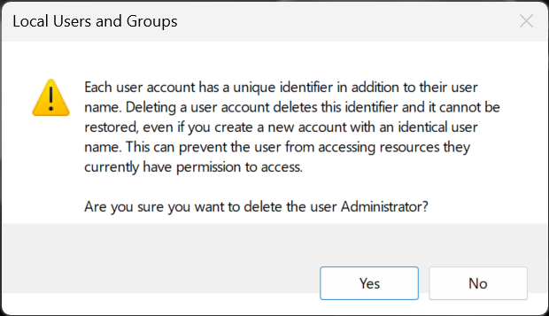 Możesz odczuwać potrzebę usunięcia niektórych standardowych kont użytkowników i grup znajdujących się na komputerze z systemem Windows 11 lub Windows 10. Jeśli spróbujesz zrobić coś takiego, powinieneś otrzymać ostrzeżenie od systemu operacyjnego o problemach, które mogą się pojawić. Oto, co zobaczysz na przykład, jeśli spróbujesz usunąć konto administratora: