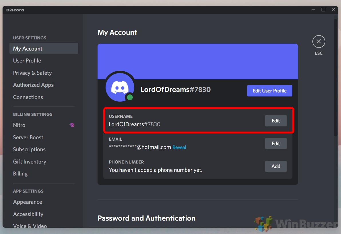 W „Moje konto” dotknij „Edytuj” obok swojej nazwy użytkownika Discord