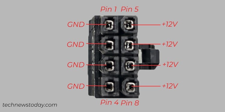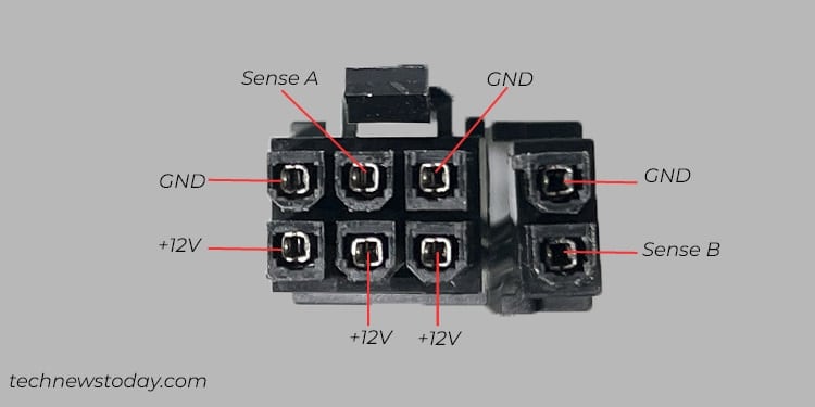 Jak widać na powyższym obrazku, 8-stykowe złącze PCIe ma trzy styki dla linii 12 V, trzy dla uziemienia, a pozostałe dwa dla wykrywania napięcia.