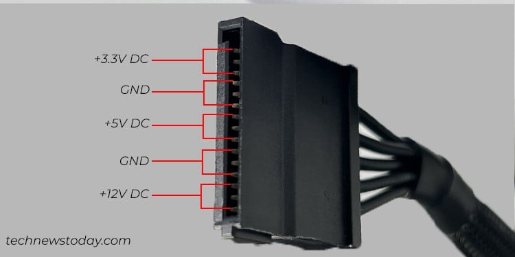 Łącznie na złączu zasilania ATX znajduje się pięć pinów +5V DC. Jak zapewne już się domyśliłeś, ten pin w szczególności zasila 5 V DC zasilanie twojego systemu, w tym wbudowanych dysków, takich jak dyski SSD, i innych urządzeń peryferyjnych.
