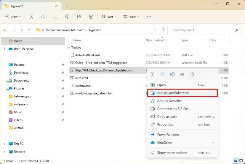 Kliknij prawym przyciskiem myszy plik „Pomiń_TPM_Check_on_Dynamic_Update.cmd” i wybierz Uruchom jako administrator.