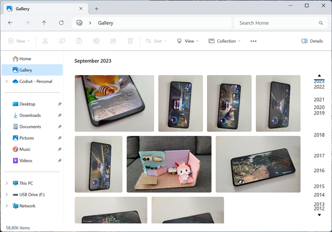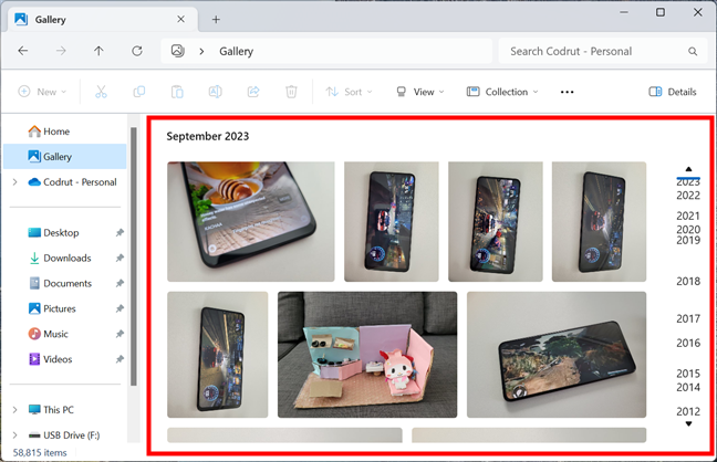 Kiedy uzyskujesz dostęp w Galerii w Eksploratorze plików zobaczysz siatkę miniatur zdjęć posortowanych według daty ich zrobienia. Możesz przewinąć w dół za pomocą myszy, aby zobaczyć więcej zdjęć, lub możesz użyć paska przewijania po prawej stronie okna.