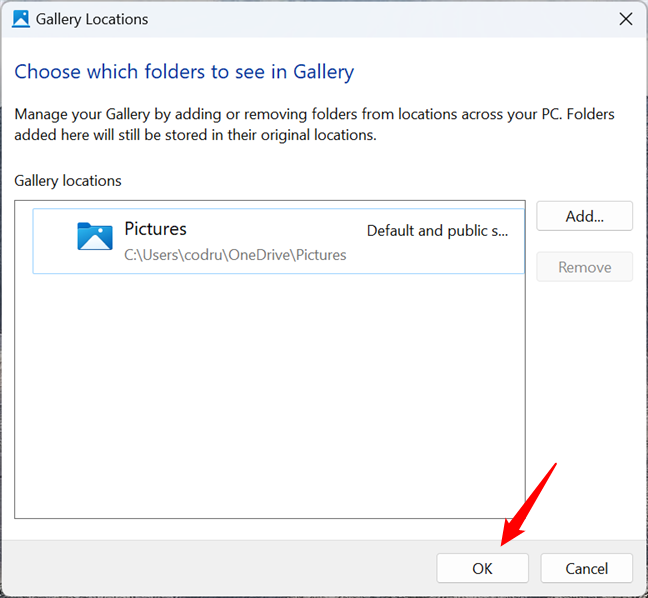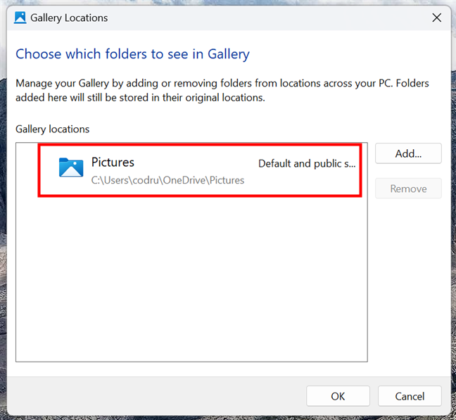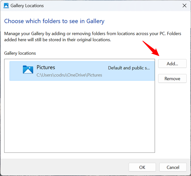 Jeśli chcesz uwzględnić nowy folder, kliknij lub naciśnij przycisk Dodaj… po prawej stronie listy lokalizacji Galerii.