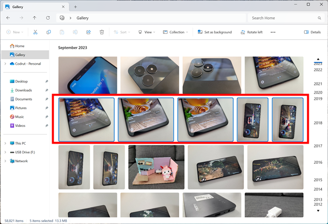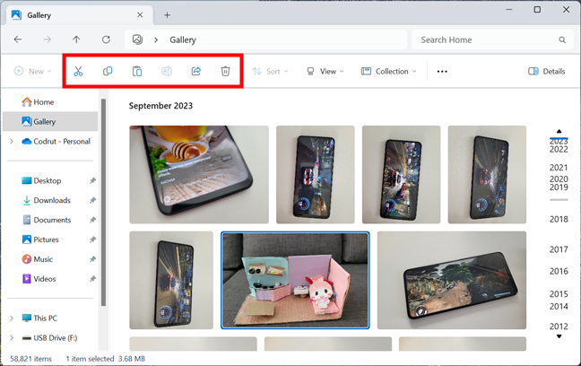 Po wybraniu jedno lub więcej zdjęć w Galerii z Eksploratora plików, możesz skorzystać z menu u góry, aby wykonać na nich działania. Możesz na przykład wycinać, kopiować, wklejać, udostępniać lub usuwać zdjęcia. Jednakże, chociaż na pasku poleceń Eksploratora plików dostępne są przyciski Zmień nazwę i Sortuj, nie zostały one aktywowane na moim komputerze z systemem Windows 11. Prawdopodobnie jest to błąd, ponieważ nie rozumiem, dlaczego Microsoft nie pozwoliłby nam na zmianę nazw zdjęć bezpośrednio z Galerii Eksploratora plików lub sortowanie naszych kolekcji zdjęć według kryteriów innych niż data.