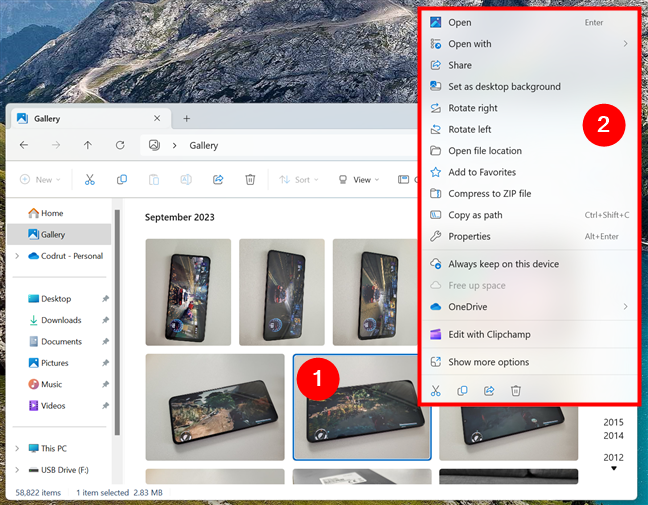 Możesz kliknąć dowolne zdjęcie prawym przyciskiem myszy( s) w Galerii Eksploratora plików