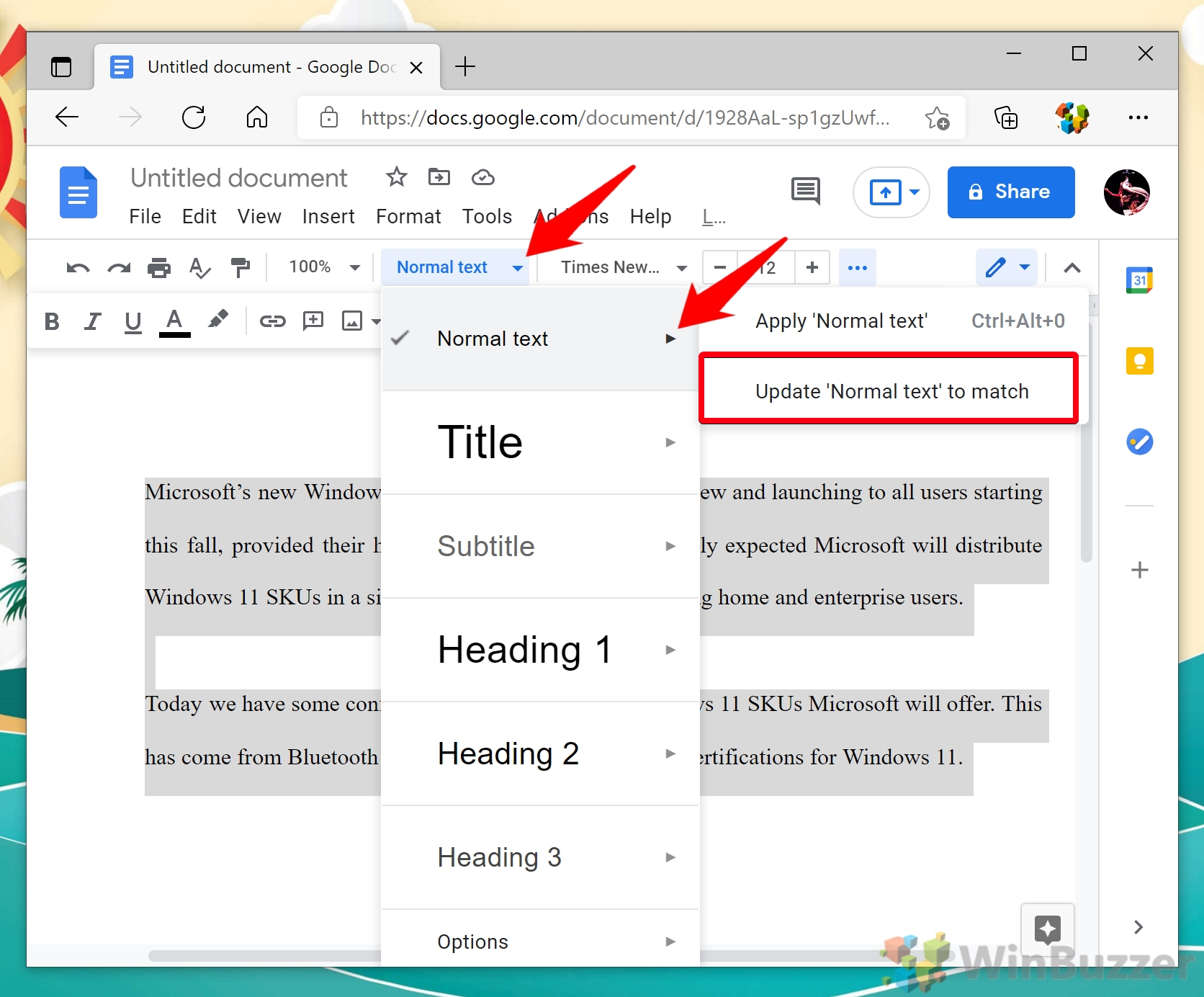 Po dostosowaniu czcionki, rozmiaru i odstępów ponownie zaznacz tekst, kliknij prawym przyciskiem myszy i wybierz „Aktualizuj „Zwykły tekst“, aby dopasować”. Spowoduje to aktualizację domyślnego stylu tekstu podstawowego. Zastosuj zmiany w nagłówkach i podtytułach
