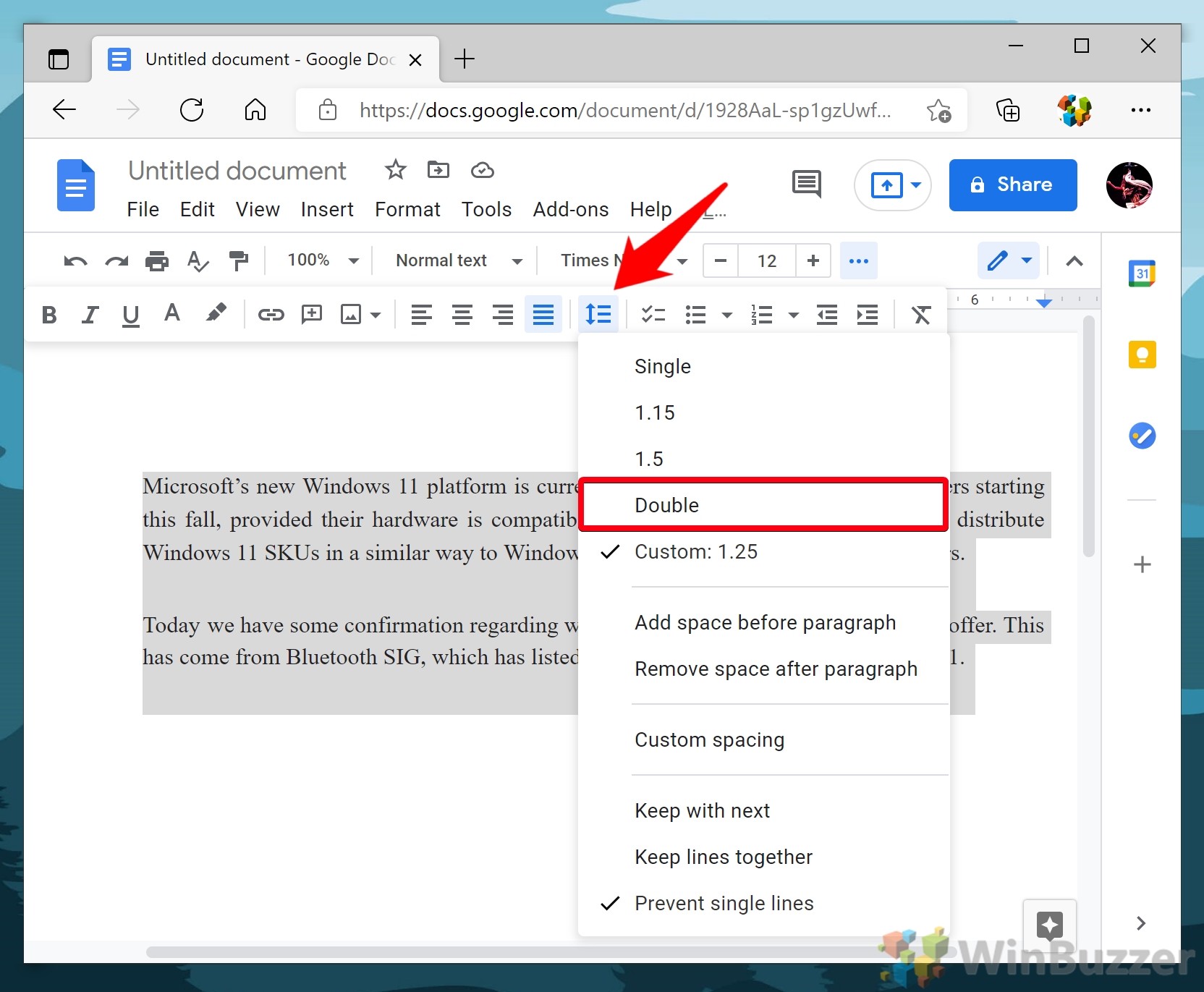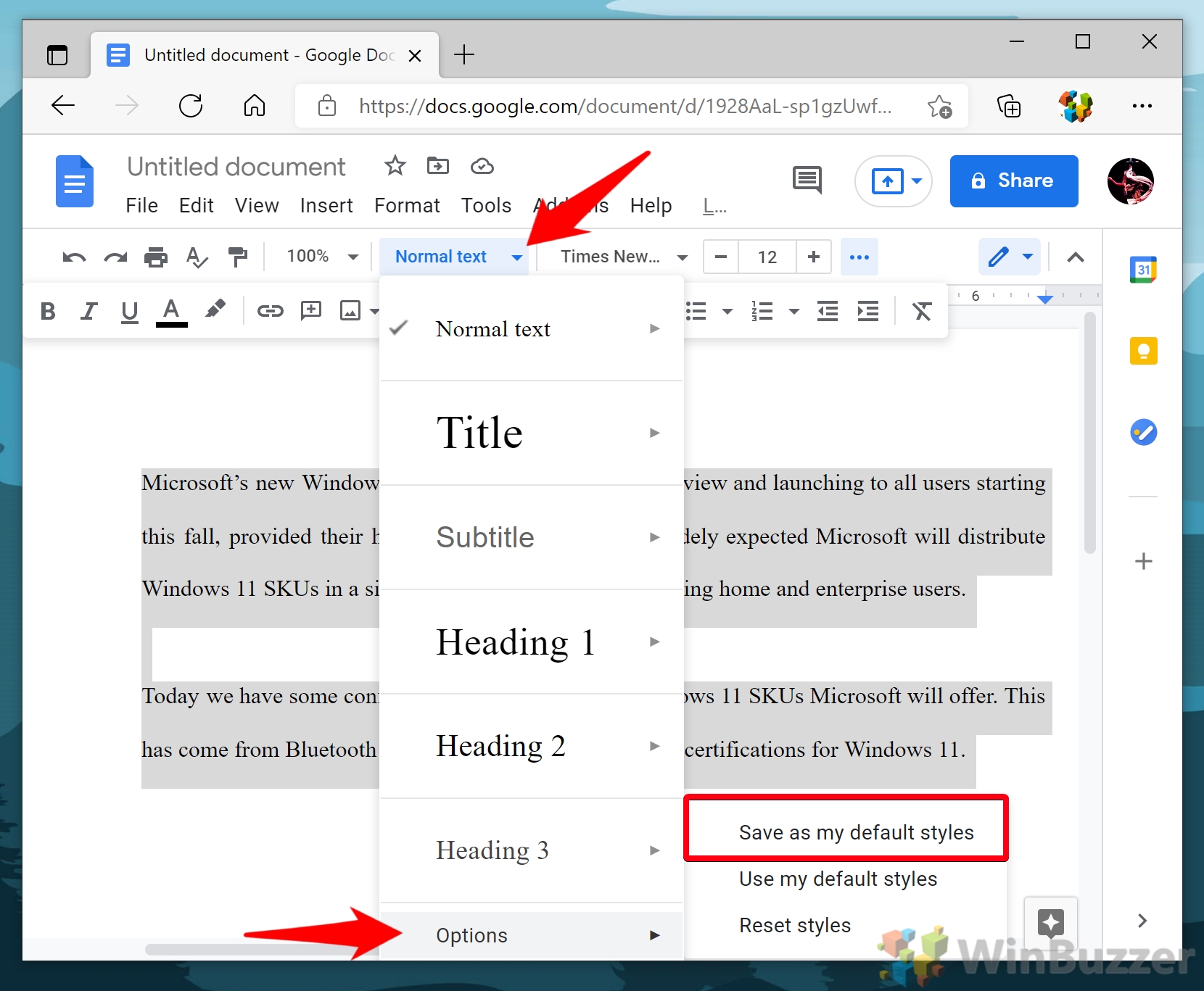 Aby zastosuj niestandardowe ustawienia do istniejącego dokumentu, otwórz dokument, zaznacz cały tekst (Ctrl+A w systemie Windows, Cmd+A w przypadku komputerów Mac) i ręcznie zastosuj preferowany styl czcionki, rozmiar i odstępy między wierszami. Na koniec, aby ustawić te style jako domyślne dla przyszłego tekstu, kliknij akapit prawym przyciskiem myszy, wybierz „Style” z menu rozwijanego, a następnie „Aktualizuj „Normalny tekst”, aby dopasować” pod kątem czcionki i rozmiaru, a następnie zastosuj preferowane odstępy między wierszami opcje odstępów na pasku narzędzi.