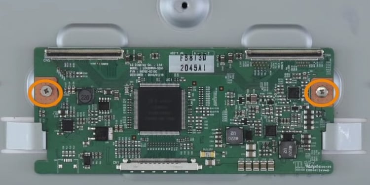 Kolejnym elementem wyświetlacza, który może ulec uszkodzeniu, jest płytka T-Con. Główną funkcją płyty T-Con jest przesyłanie sygnałów wyświetlacza z płyty głównej do panelu wyświetlacza za pomocą kabli taśmowych.