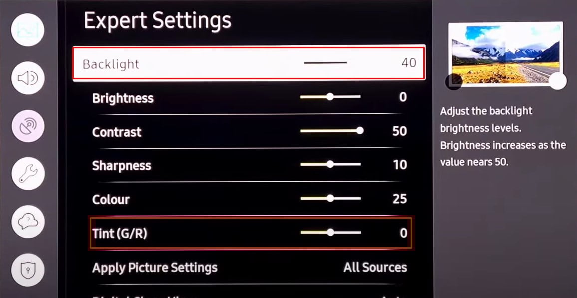 Otwórz Ustawienia.Wybierz menu Obraz.Przesuń w prawo i dotknij Ustawienia eksperta. Zobaczysz tam różne konfiguracje kolorów.Do napraw zniekształcenie kolorów, najpierw zmień poziomy intensywności Podświetlenia i Odcień. Zalecamy pozostawienie Tint na zero (0) i ustawienie podświetlenia zgodnie z preferencjami kolorystycznymi.