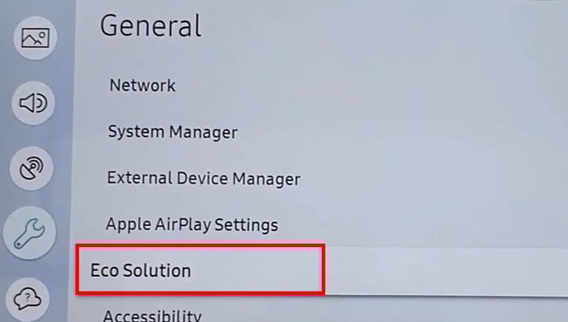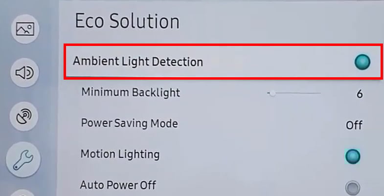 Otwórz telewizor Ustawienia .Przejdź do karty Ogólne .Wybierz Rozwiązanie ekologiczne po prawej stronie.Wyłącz wykrywanie światła otoczenia.