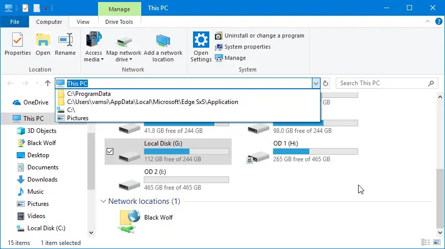Większość nie wie o tym, ale eksplorator plików śledzi każdą ścieżkę folderu Wprowadzasz w jego pasek adresu. Pomaga to szybko przejść na wcześniejsze ścieżki bez ręcznego wprowadzania do niej wielokrotnie. Załóżmy na przykład, że masz folder zagnieżdżony głęboko w innym folderze. Zamiast ręcznie nawigować do folderu, możesz po prostu wpisać jego ścieżkę na pasku adresu i nacisnąć Enter. Następnym razem, gdy chcesz uzyskać dostęp do tego samego folderu, klikając strzałkę w dół w pasku adresu Eksploratora pliku, pokazuje wcześniej odwiedzoną ścieżkę w historii.