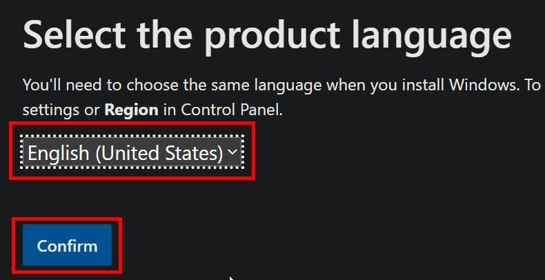 Później wybierz język wyboru z menu „Wybierz język produktu” i kliknij „ potwierdź “. W moim przypadku wybrałem „angielski (Stany Zjednoczone)” jako język.