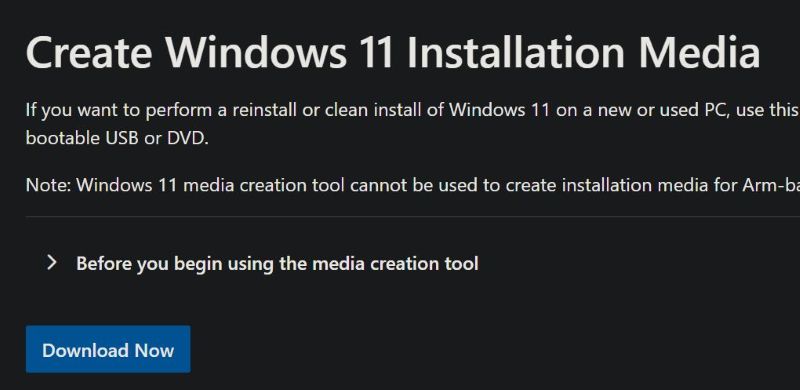 Najpierw musimy pobrać narzędzie do tworzenia mediów. Aby to zrobić, przejdź do tej strony, przewiń w dół do sekcji „Utwórz multimedia instalacyjne Windows 11″ i kliknij przycisk „ Pobierz teraz “.