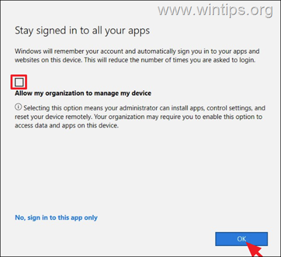 Kliknij przycisk Połącz na ekranie „Uzyskaj dostęp do pracy lub szkoły”, aby ponownie połączyć się z kontem MS i ponownie zarejestrować urządzenie. Otwórz dowolną aplikację Microsoft 365, postępuj zgodnie z instrukcjami, aby zalogować się na swoje konto Microsoft, ale na ostatnim ekranie ODZNACZ opcję „Pozwól mojej organizacji zarządzać moim urządzeniem” i kliknij OK.