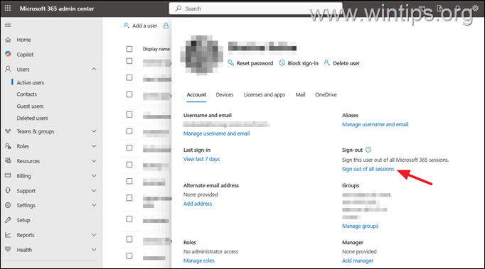 Metoda 5. Wyloguj użytkownika ze wszystkich sesji w centrum administracyjnym Office 365.