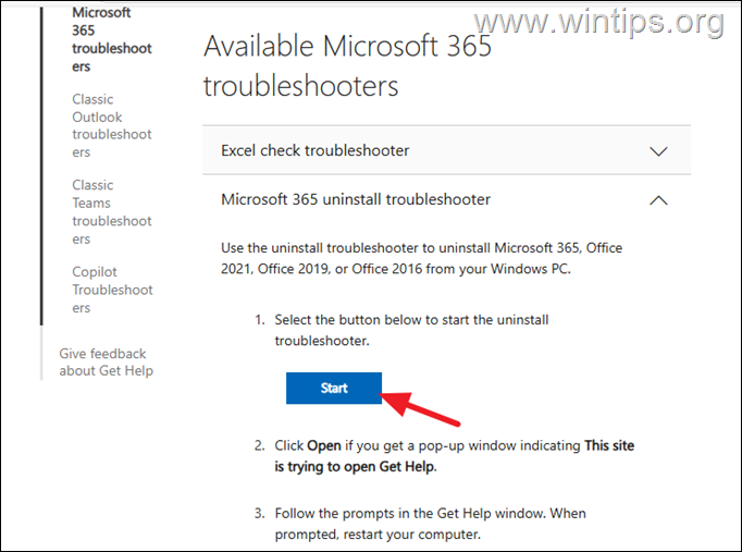 2. Odwiedź Strona rozwiązywania problemów z Microsoft 365, rozwiń Microsoft 365 odinstaluj narzędzie do rozwiązywania problemów i kliknij przycisk Start.