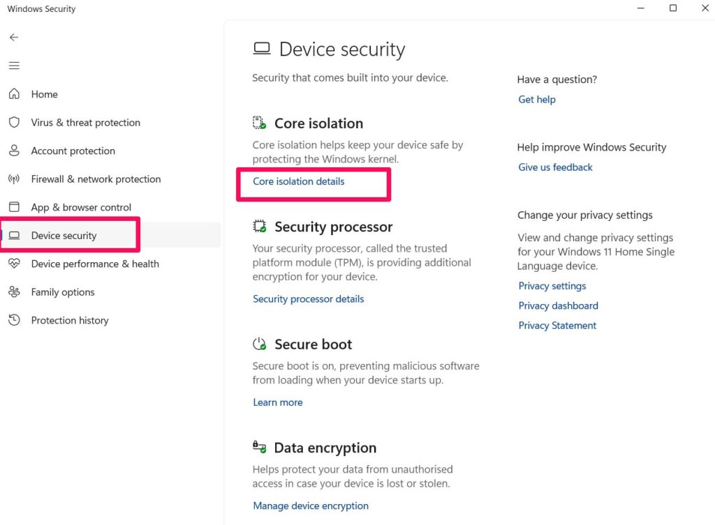 Otwórz Zabezpieczenia systemu Windows, następnie Zabezpieczenia urządzenia, a następnie Izolacja rdzenia. Wyłącz Integralność pamięci. Uruchom ponownie komputer.