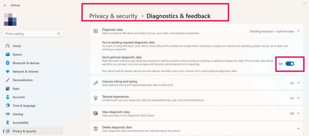 Przejdź do opcji Ustawienia > Prywatność i bezpieczeństwo. Wyłącz wszystkie przełączniki w obszarze Diagnostyka i opinie. Jeśli jesteś zaawansowanym użytkownikiem, możesz użyć Edytora zasad grupy, aby całkowicie wyłączyć telemetrię.