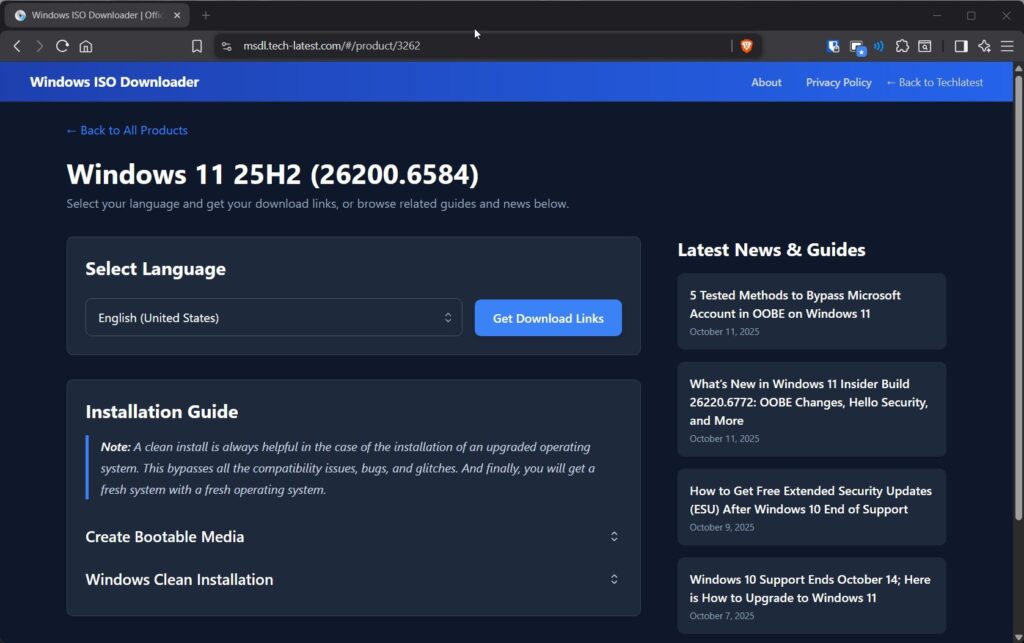 Odwiedź https://msdl.tech-latest.com Poszukaj Windows 11, a następnie wybierz Wersję 25H2. Wybierz preferowany język.