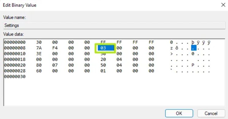 Naciśnij Win + R, wpisz regedit i naciśnij Enter. Przejdź do tej lokalizacji: HKEY_CURRENT_USER\Software\Microsoft\Windows\CurrentVersion\Explorer\StuckRects3 Kliknij dwukrotnie wartość Ustawienia po prawej stronie. Zobaczysz długi ciąg liczb. Znajdź drugi wiersz, szóstą kolumnę (wartość często zaczyna się od 03). Zmień tę wartość na: 01 → Pasek zadań u góry 00 → Lewy 02 → Prawy 03 → Dół