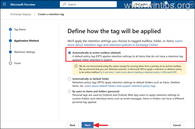 Po utworzeniu nowej polityki przechowywania kontynuuj i przypisz ją do skrzynek pocztowych użytkowników zgodnie z instrukcjami poniżej:
