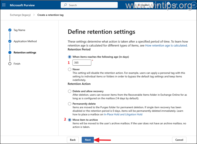 7. W ustawieniach przechowywania określ, po ilu dniach (1) wiadomość e-mail będzie automatycznie przenoszona do archiwum (np. po „365″ w tym przykładzie) i w sekcji „Działanie przechowywania” wybierz opcję Przenieś element do archiwum (2). Następnie kliknij Dalej.