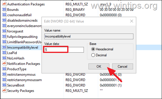 2. W prawym okienku sprawdź, czy wartość REG_DWORD „lmcompatibilitylevel” jest inna (np. „2“) w tym przykładzie). Jeśli tak, otwórz go, ustaw dane wartości na „5” i kliknij OK.