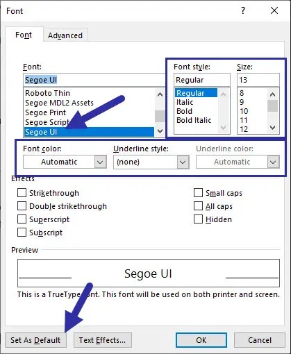 W oknie dialogowym „Czcionka” wybierz czcionkę, którą chcesz ustawić jako domyślną. Menu rozwijane „Czcionka”. Następnie możesz także skonfigurować ustawienia opcjonalne, takie jak styl i rozmiar czcionki. Na przykład zdecydowałem się na czcionkę „Segoe UI” jako czcionkę domyślną i ustawiłem styl i rozmiar odpowiednio na „Normalny” i „13″.