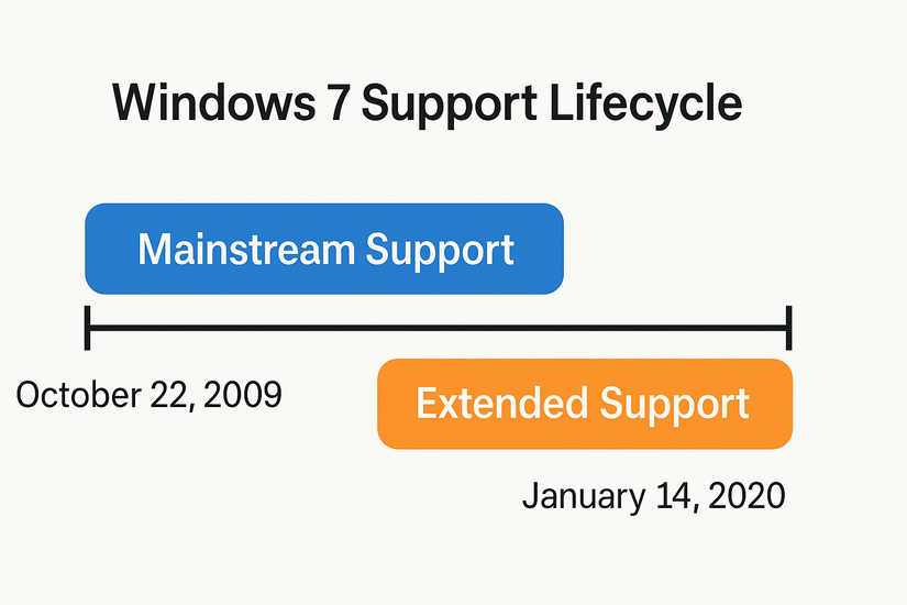 Cykl życia produktu Microsoft zapewnił Windows 7 dekadę wsparcia, podzielonego na fazy główne i rozszerzone. Znajomość tych dat pomaga użytkownikom zrozumieć, kiedy aktualizacje i poprawki zostały zatrzymane.