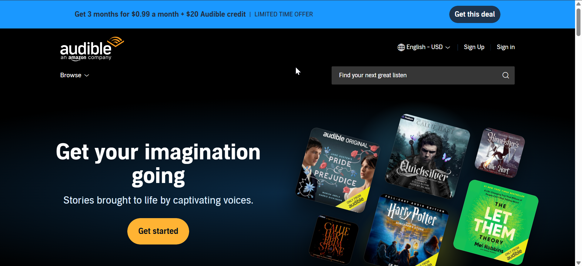 Audible umożliwia łatwe słuchanie książek na wszystkich urządzeniach. Wykorzystuje członkostwo, kredyty i duży katalog transmisji strumieniowych, aby uprościć odkrywanie audiobooków i cieszyć się nimi.