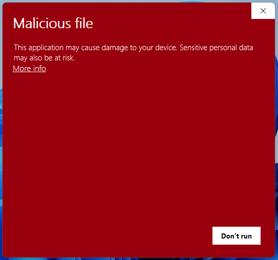 Ponadto, jeśli plik jest zdecydowanie złośliwy, filtr SmartScreen zablokuje go i poinformuje, że „Aplikacja może spowodować uszkodzenie urządzenia. Wrażliwe dane osobowe również mogą być zagrożone”.