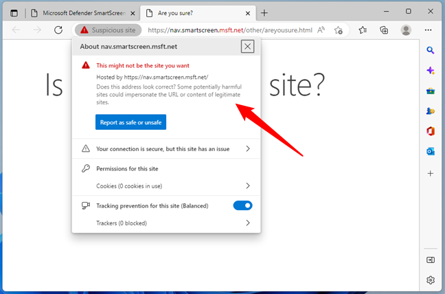 Jeśli odwiedzana witryna wygląda podejrzanie, SmartScreen w Microsoft Edge wyświetla komunikat o treści: „To może nie być witryną, którą chcesz.”