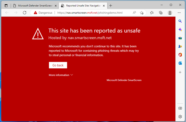 Jeśli odwiedzana witryna jest znana z wyłudzania informacji lub hostowania złośliwego oprogramowania, Microsoft Edge blokuje jej ładowanie i ostrzega o zbliżającym się niebezpieczeństwie, informuję, że „Ta witryna została zgłoszona jako niebezpieczna”.