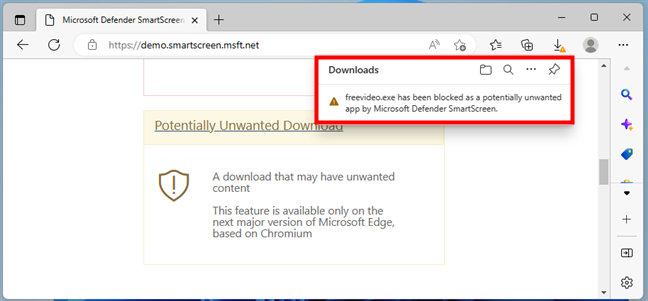 Zarówno w systemie Windows 10, jak i Windows 11, gdy próbujesz pobrać plik z Internetu, który Microsoft uważa za potencjalnie niechciany, filtr SmartScreen blokuje go i informuje, że „[plik] został zablokowany jako potencjalnie niechciana aplikacja przez Microsoft Defender SmartScreen”.