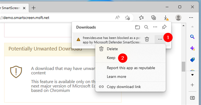 Jeśli SmartScreen interweniował w przeglądarce Microsoft Edge, ostrzegając, że plik, który chcesz pobrać, nie jest bezpieczny lub pobiera go niewiele osób, ale nadal go chcesz, kliknij przycisk z trzema kropkami (…) z monitu Pobieranie i wybierz opcję Zachowaj w wyświetlonym menu.