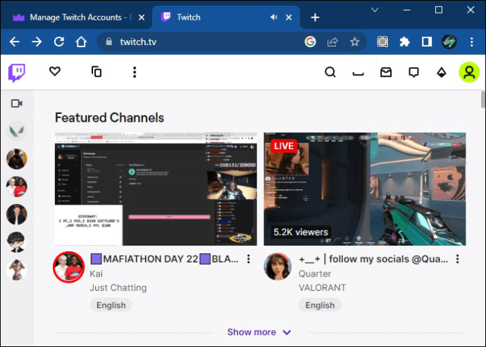 Zaloguj się na swoje konto Twitch.Kliknij swój awatar w prawym górnym rogu.