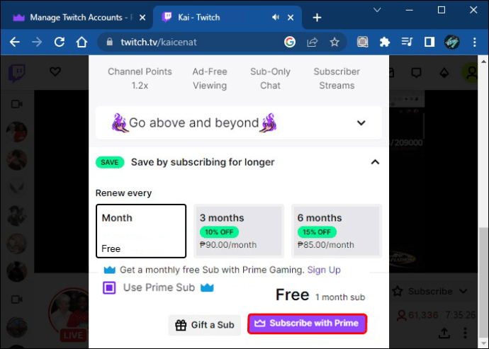 Po połączeniu kont możesz korzystać z Amazon Prime, aby zasubskrybować jeden streamer za darmo. To jedna z największych zalet subskrypcji Amazon Prime, szczególnie dla zapalonych graczy i entuzjastów treści Twitcha.