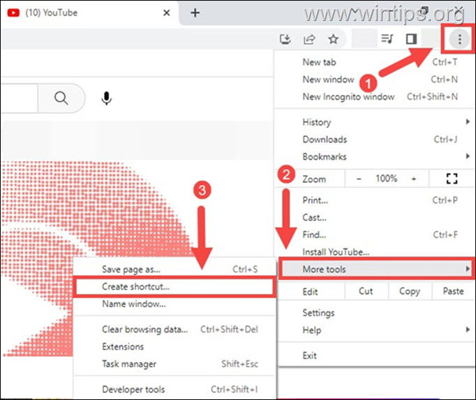 2. Faceți clic pe cele trei puncte verticale pictograma din colțul din dreapta sus și accesați Mai multe instrumente > Creați o comandă rapidă.