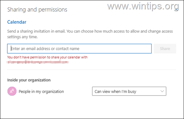 Dacă încercați să împărtășiți un Calendar Office 365 și primiți eroarea „Nu aveți permisiunea de a vă împărtăși calendarul cu [email protected]”