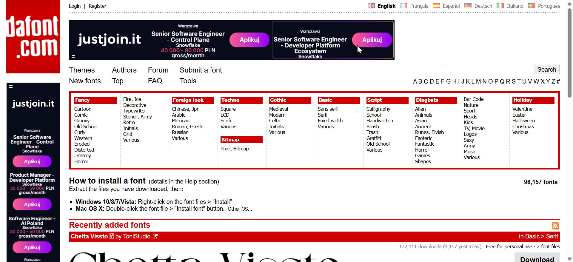 Accesați site-ul oficial Dafont introducând manual URL-ul pentru a evita paginile false. Verificați licența oricărui font înainte de descărcare, deoarece unele programe sunt gratuite, în timp ce altele necesită o licență pentru utilizare personală. Previzualizează orice font înainte de descărcare pentru a ști cum arată